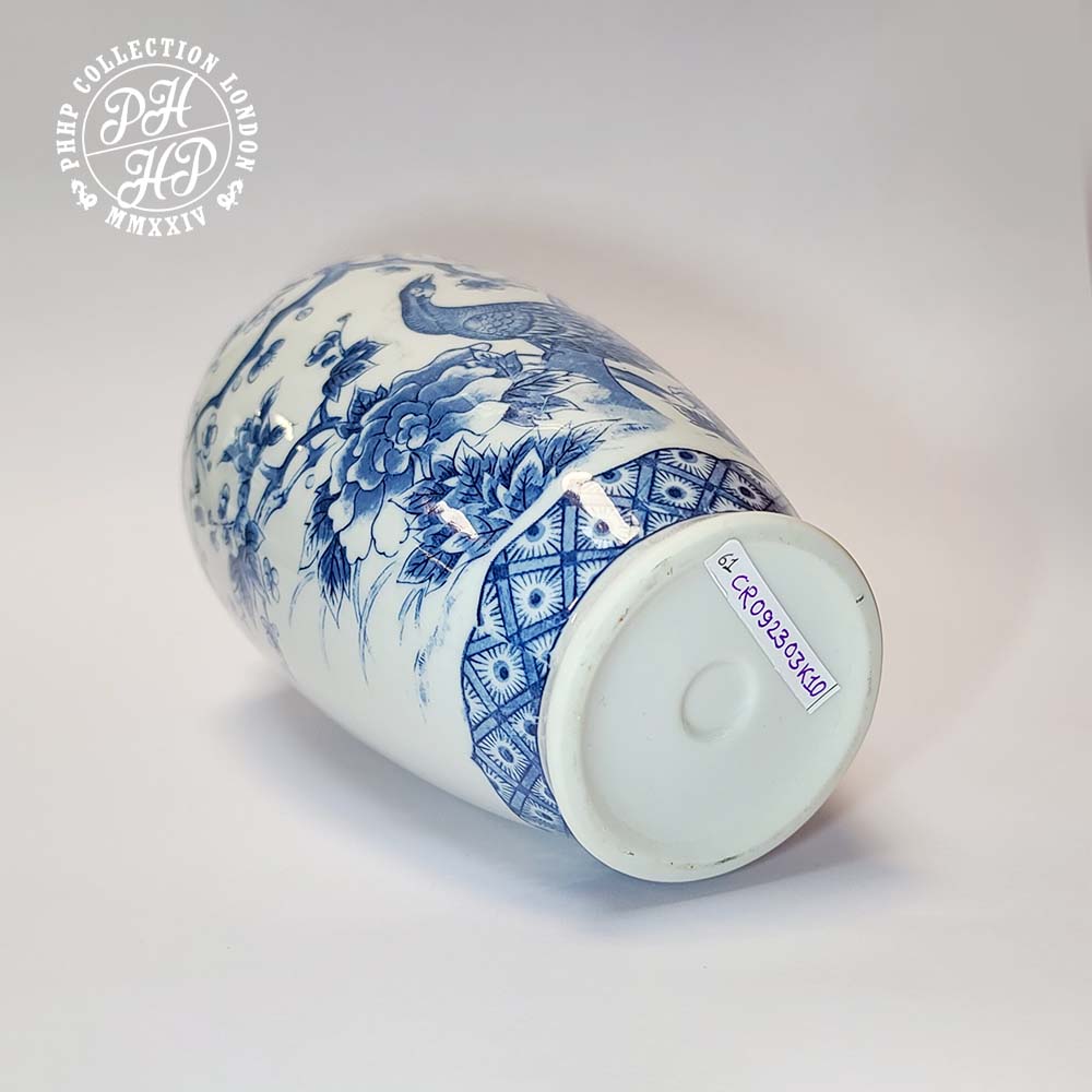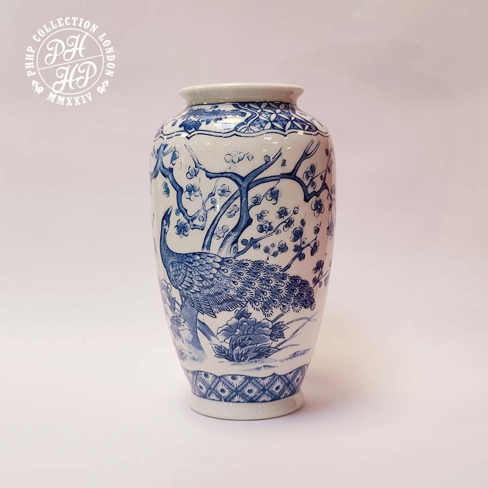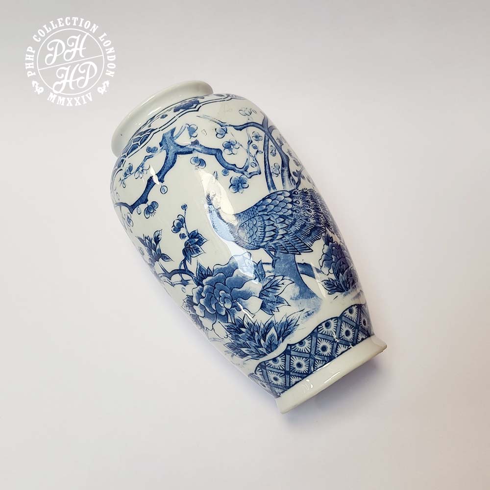 This is a beautiful blue and white cobalt blue underglaze porcelain vase. The vase displays a well grown up male peacock singing song whilst making the posture that he is about to pick the fruit too. This jar has all the hallmarks of hand painted or drawn artifact of peacock in cobalt blue in underglaze surface. The occasional shifts or breaking of the pattern in fine line assures that whether this vase was produced in the popular wrap painting porcelain production of early to mid 1900 in China. Excellent in quality, this piece of porcelain is sought after blue and white porcelain vase ideal for a private collector or museum, valuing the essence and importance of vintage/antique Chinese porcelain.