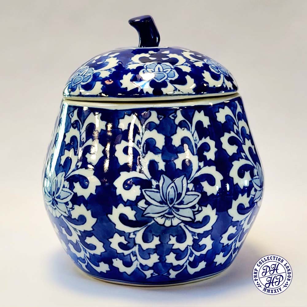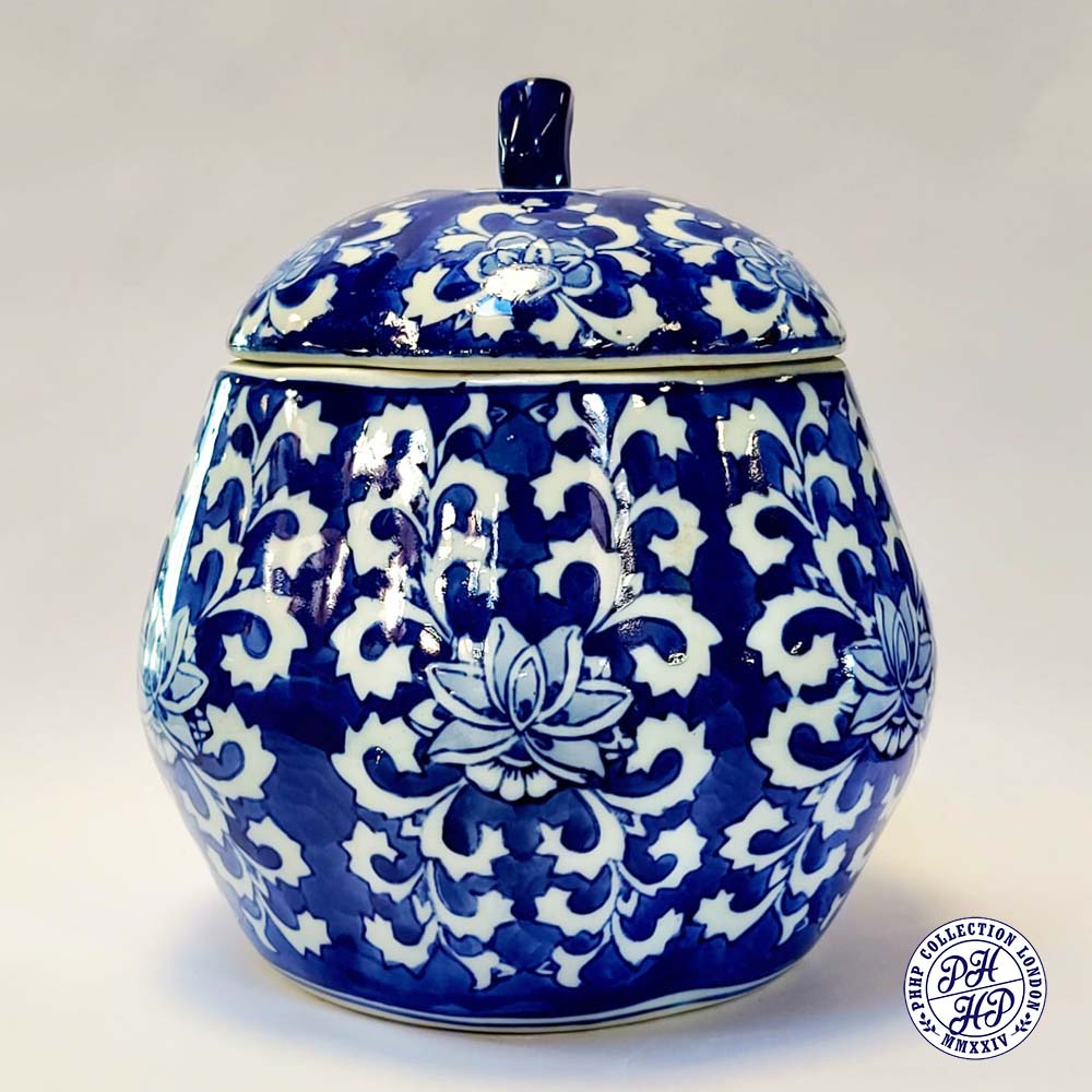 This piece of porcelain is considered to be an art deco less aggressive or political floral ornamental jar gifted to display peaceful bilateral relationship expectations by the high ranking diplomatic official to his counterpart visiting from Europe. The peony flowers blossoming amidst the lurking leaves in the iron rich deep dark blue cobalt still shows the painstaking task with a longer time to draw and paint before glazing.