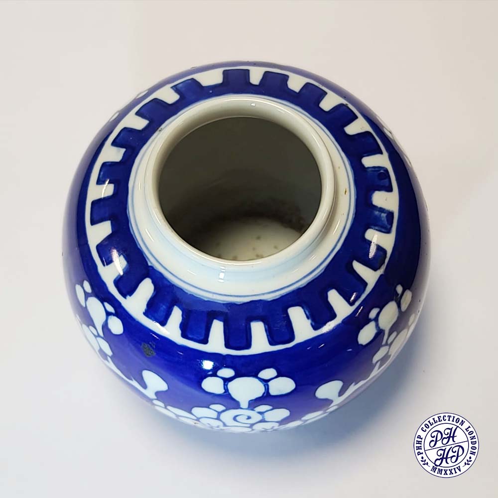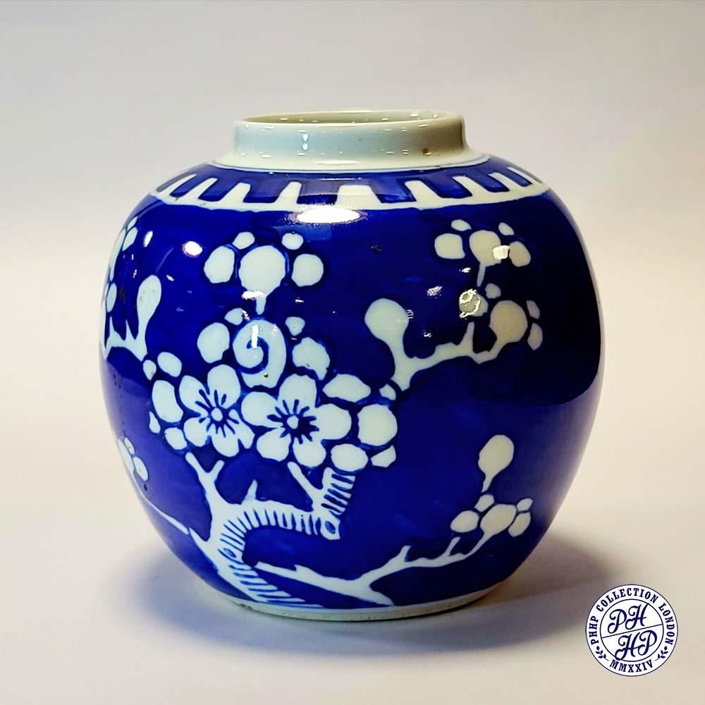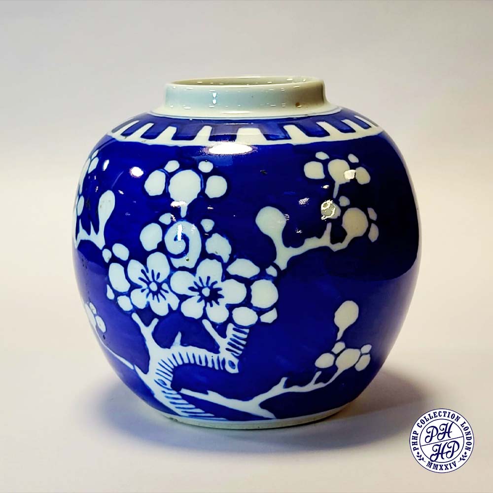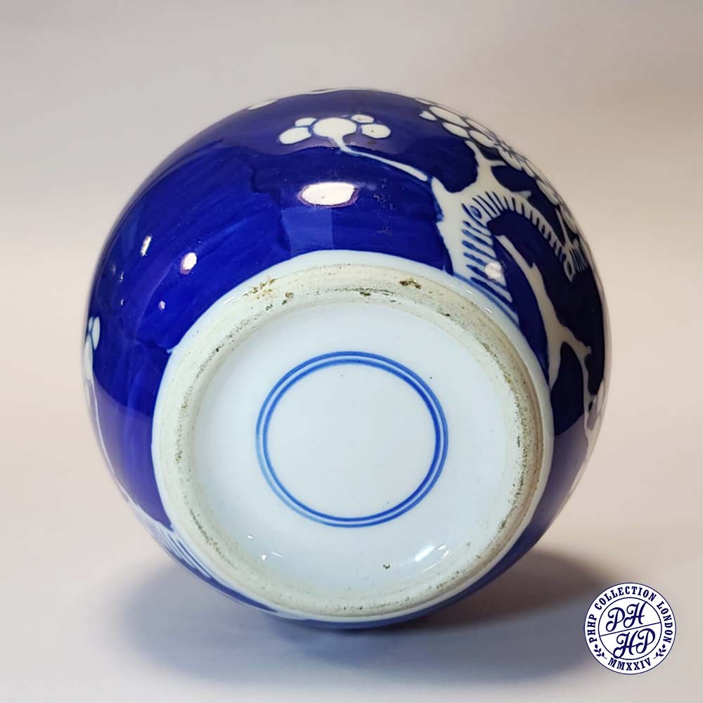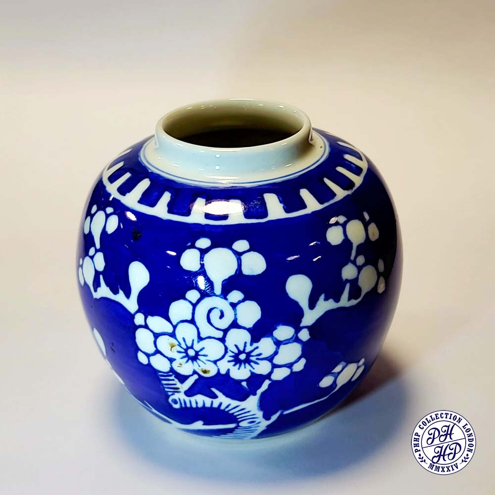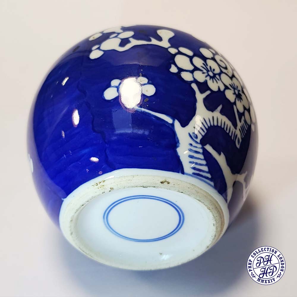 Hand painted in cobalt blue & white underglaze porcelain. The prunus blossoms on a background of cracked ice signifying the importance of the Chinese new year gift. This jar is said to be prepared as a decorative blue and white underglaze porcelain typical of ancient China.