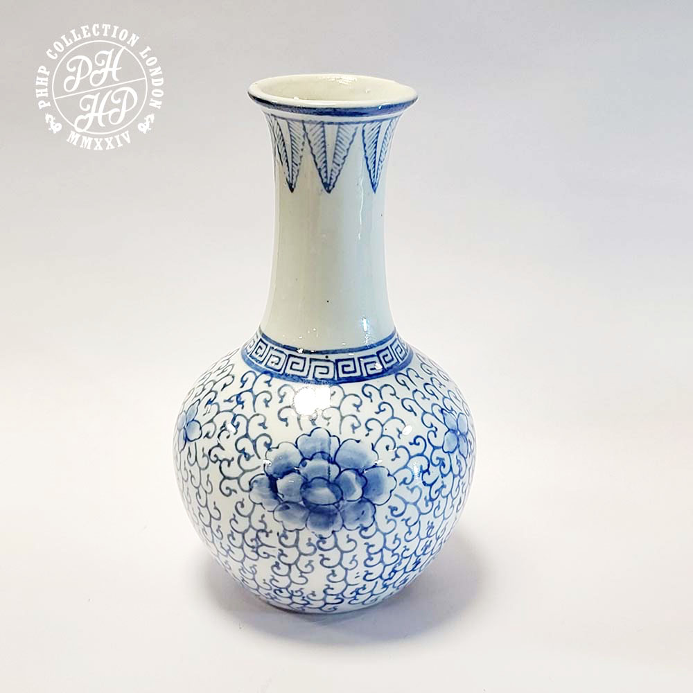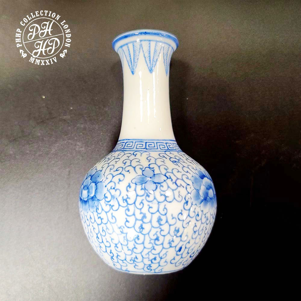 This beautiful art-deco vase is typical of Ming dynasty production of blue & white hand drawn cobalt blue underglaze porcelain. The drawings show the distinct features of peony on ornamental and yet auspicious drawings. Each line of drawings on brush to provide the meditative sensation depicting the essence of happiness and tranquility.