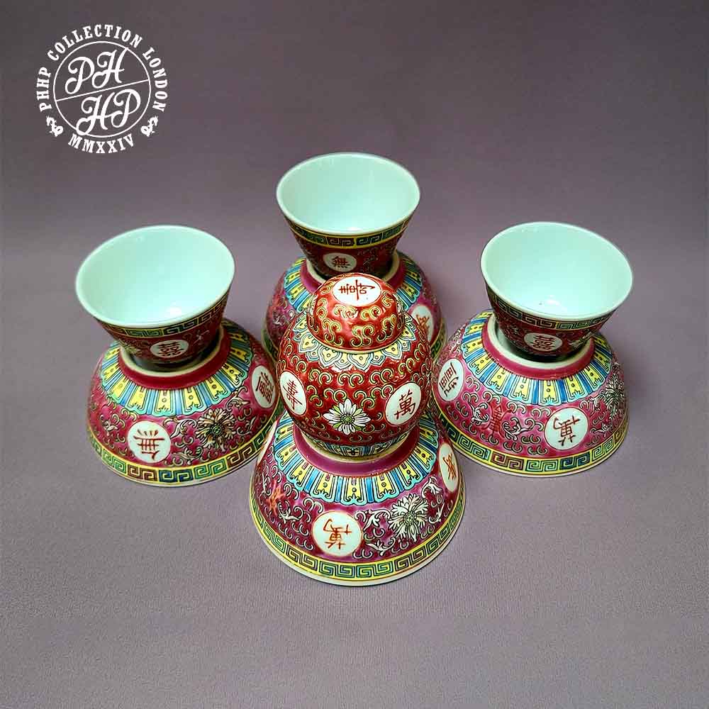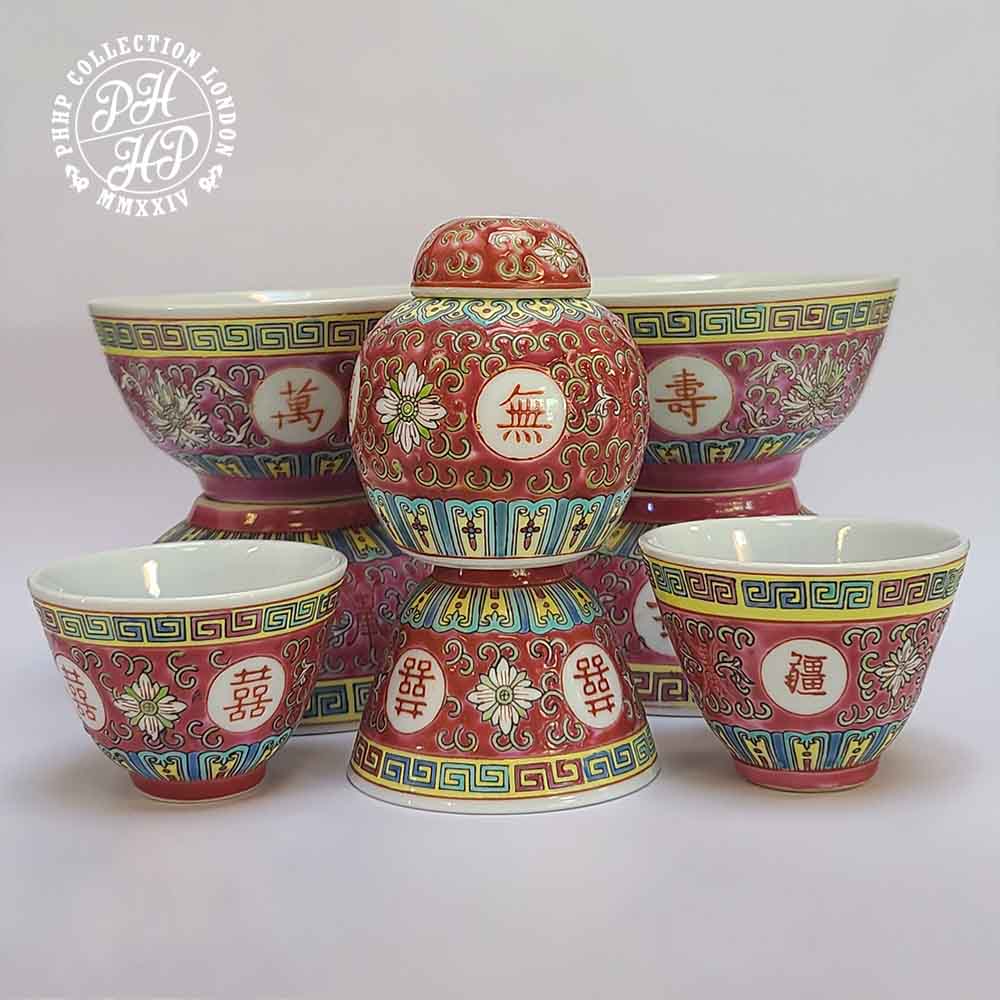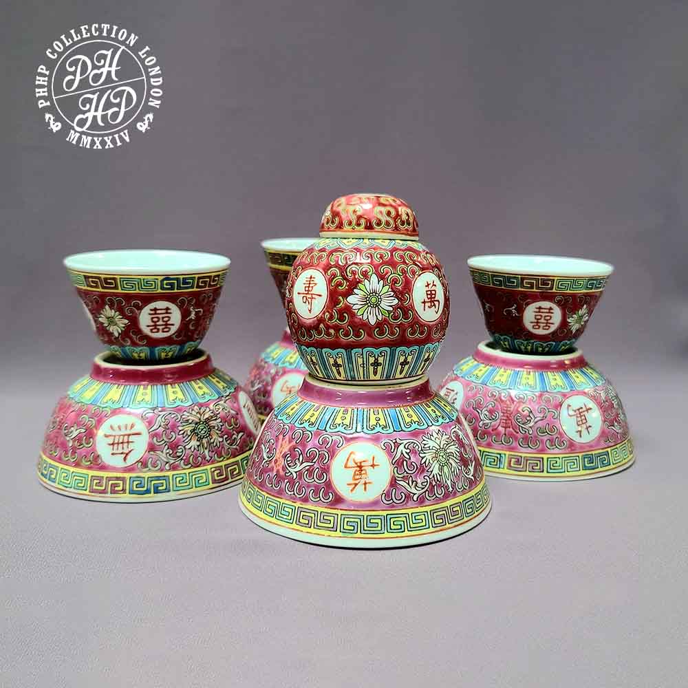 These bowls, jars and cups are coveted pieces baluster and red and pink in family verte styles of painting and production. Produced during the Republican period China. These pieces are collected from different places at different times over period of 3 years. They now form a set as unusual en-devour. It is inspiring and truly historical for it's collection coming together at one place.