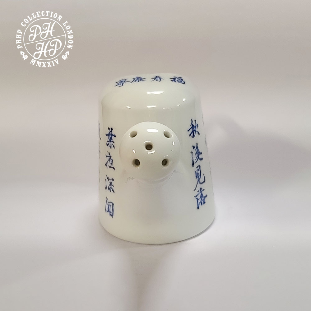 This Tea Pot is produced in a hand written cobalt blue under glazed poetry writing calligraphy for the imperial appreciation. All characters on this master piece porcelain are hand written to display, preserve and transfer, as it depicts the finest quality calligraphy by an unknown master painter serving personally in the direct supervision of the heads such as Emperor and his key people at the imperial courts.