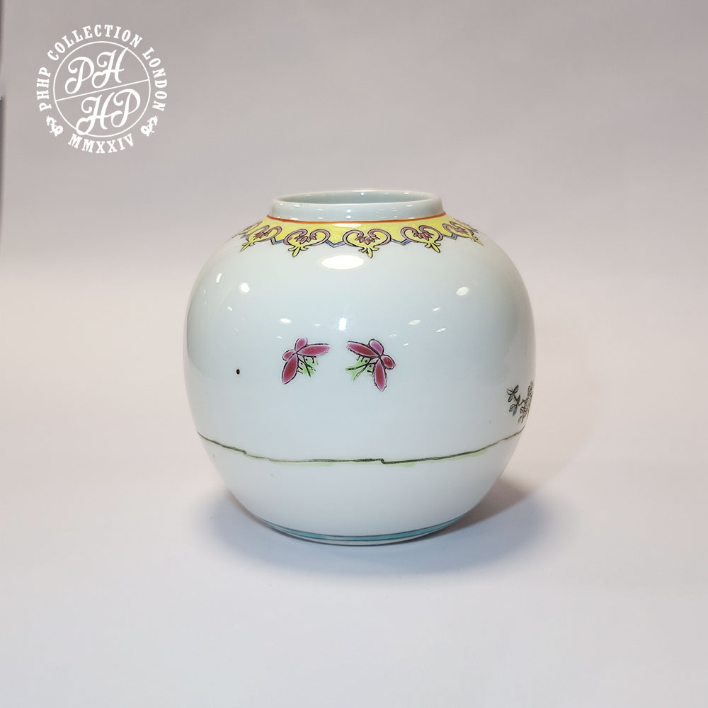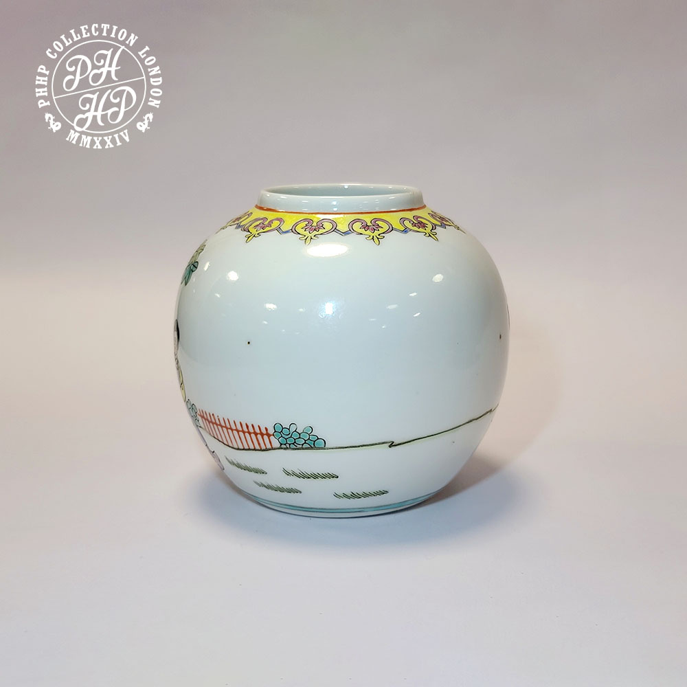 This beautiful jar without lead is a perfect example of Famille Rose, Chinese porcelain finished in multi colour such as green, red, black and yellow in underglaze and over glaze high quality porcelain production of the era during the Tongzhi emperor of mid to late Quing dynasty, imperial China. A perfect piece for the collector or museum coveting the rarity in Chinese porcelains of antiquity.