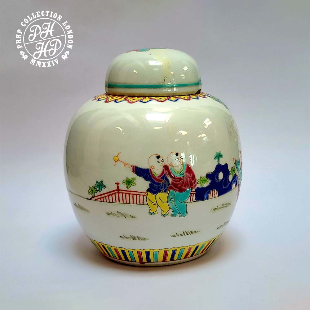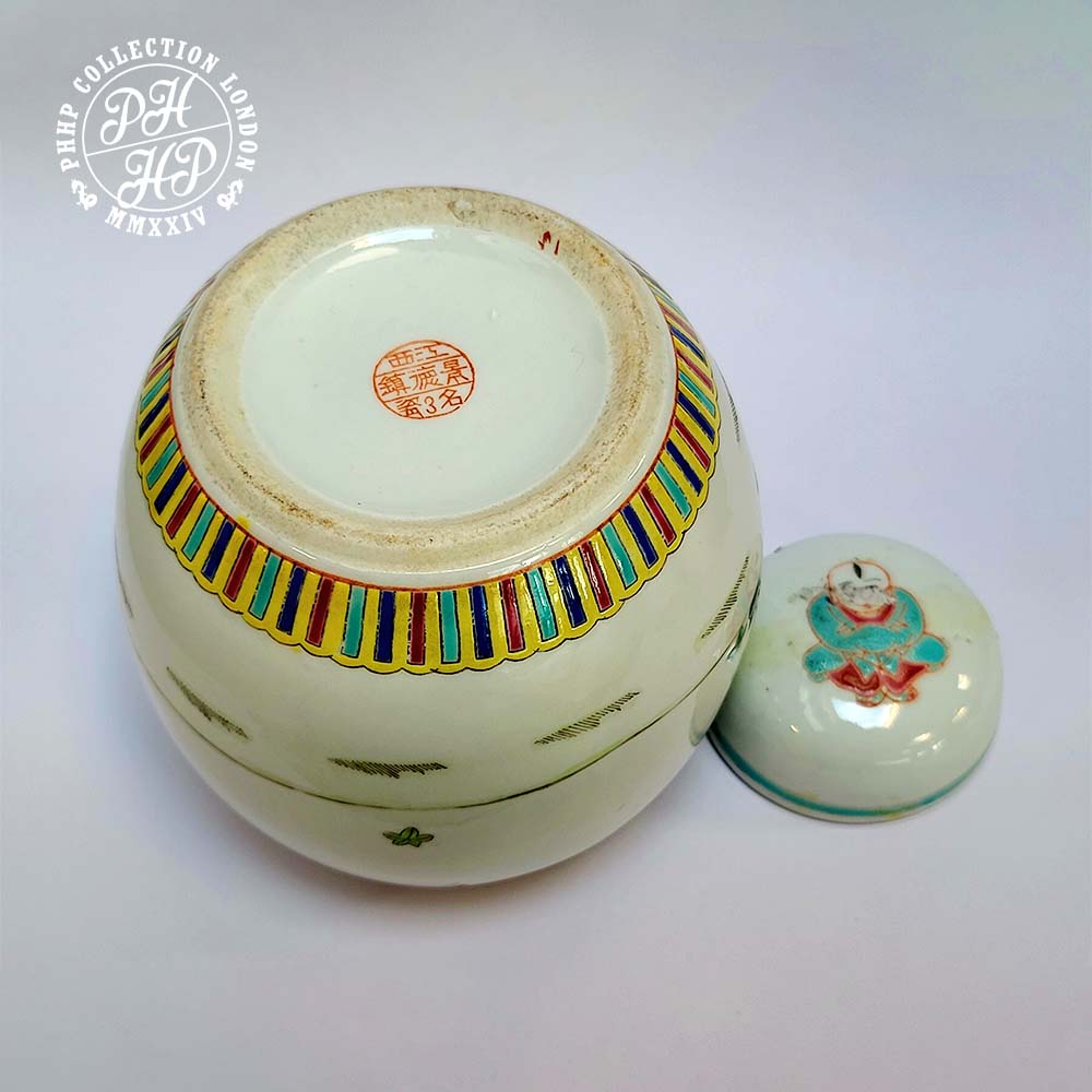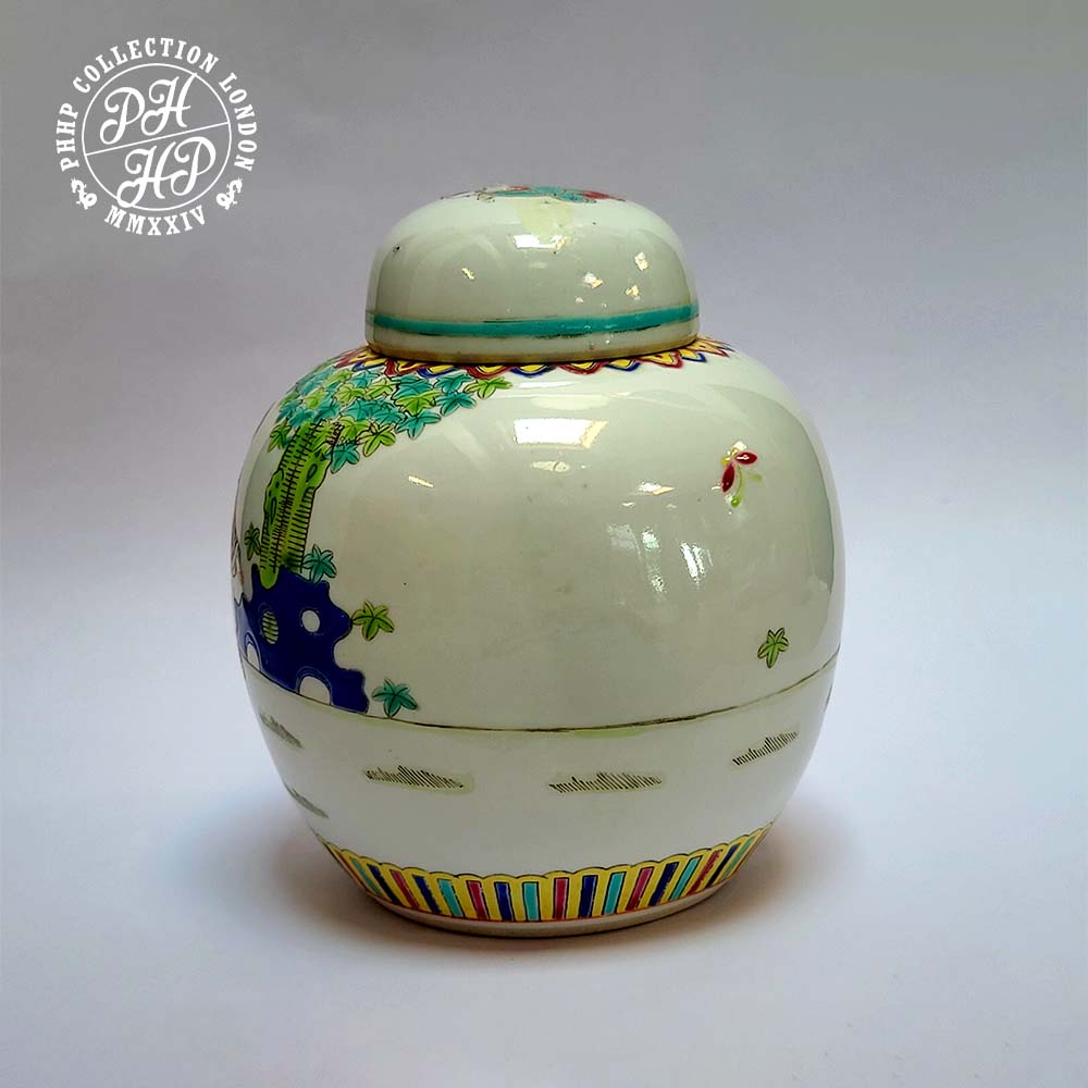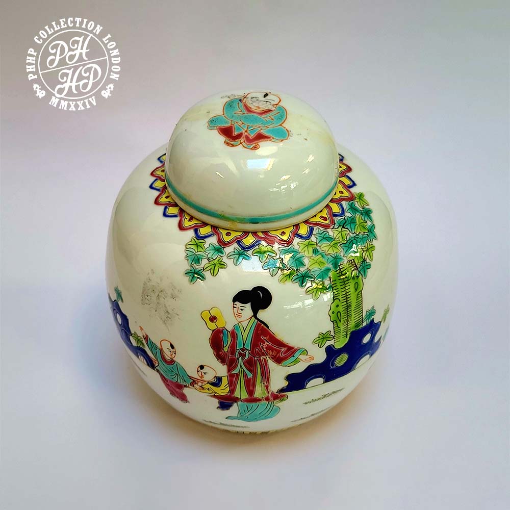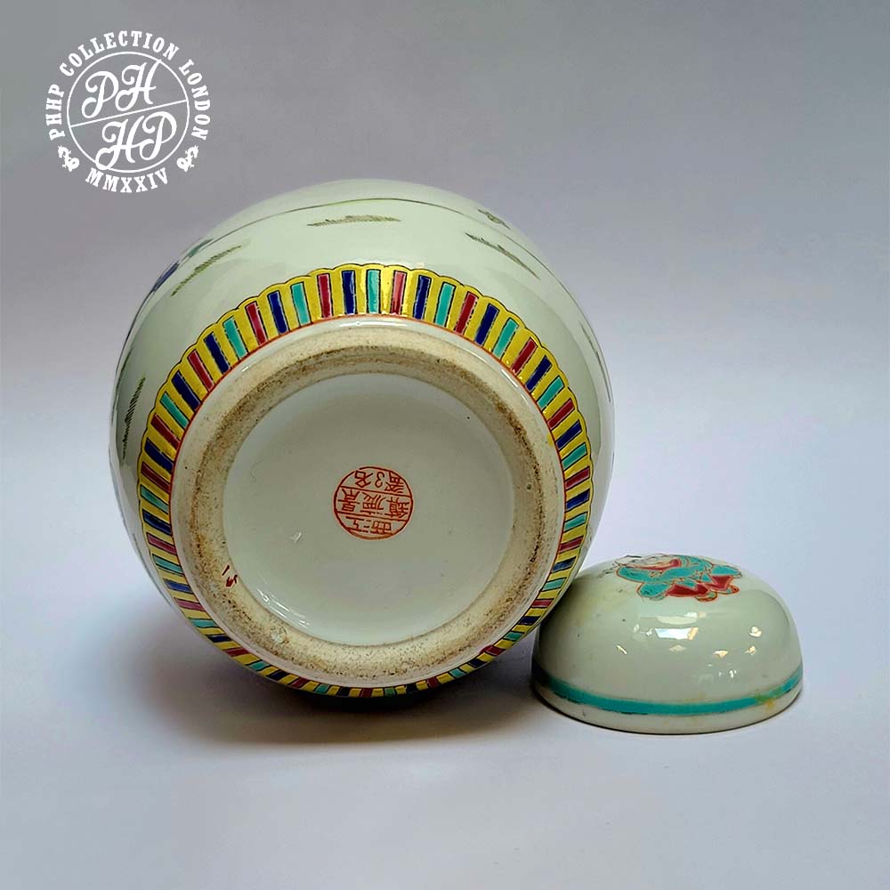 This family verte Chinese porcelain Jar in lid is designed and produced to present as decorative piece of art depicting the scholars and aristocratic girl living in the idyllic village life in rural China. Painted in green, black, red enamel in underglaze. The expression in the mark clearly outlines the story of the vanity of successes of the Jingdezhen kiln, the porcelain capital of China for centuries.