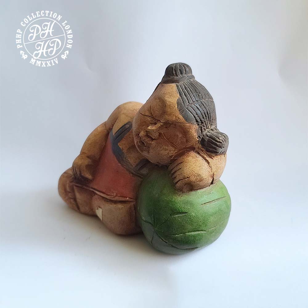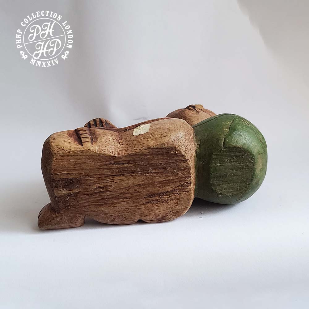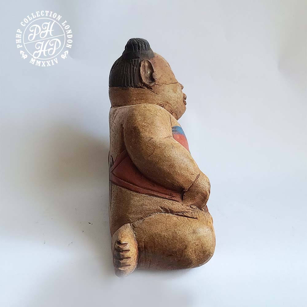 Sumo wrestlers were believed to have been originated in Japan during the Nara period (CE 710-794) and has become an essential part Japanese culture. They are also known as Rikishi in Japan. Its history is veiled in mystery and legends. Sumo wrestlers retire in age 30. Their life span is of 60 to 65 years old. They suffer from strokes, diabetes, heart, bone and joint problems. Sumo wrestlers might eat up to 10,000 calories a day. They are attracted by the athleticism, pageantry and traditions of this most Japanese of sports. This piece of Sumo wrestler carved in wood is 17th century work of art most probably produced in honour of one famous who were hailed hero within the sports at his time. Truly rare, treasure able.