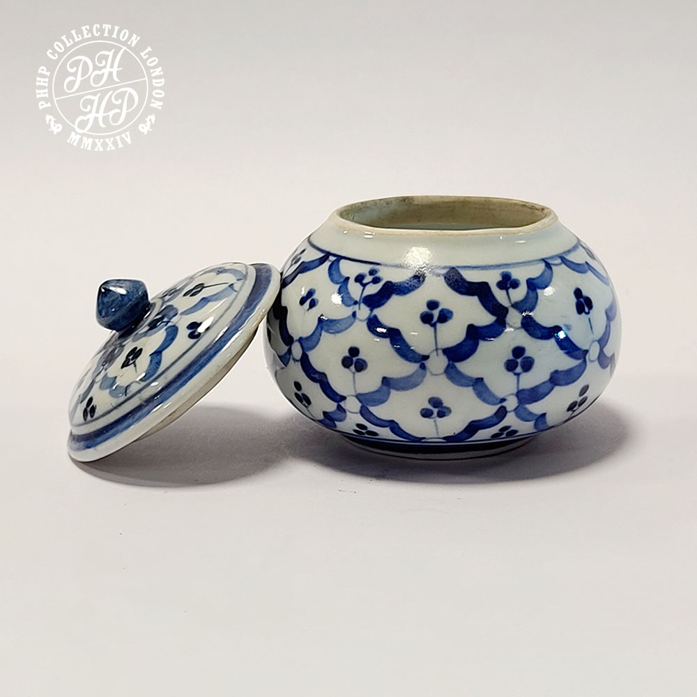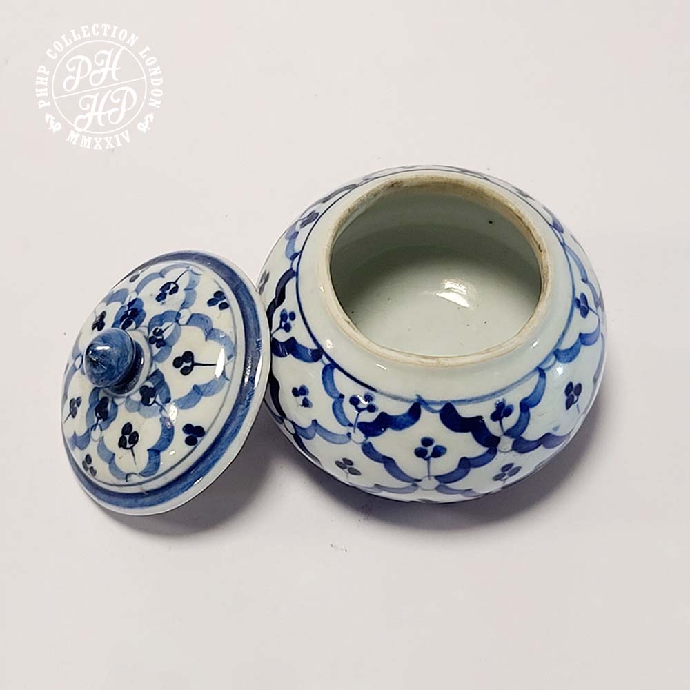 This jar is an example piece of high quality blue and white porcelain jar painted in cobalt turned blue in underglaze. Thai blue and white Porcelains in Orchids in square shapes. Unlike the Chinese blue and white porcelains, Thai porcelains are rare and highly prized. Ideal for the collectors and museums for its rarity value.
