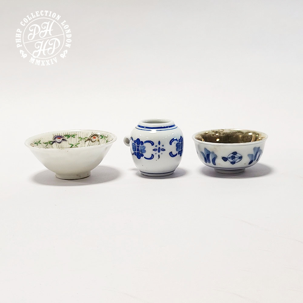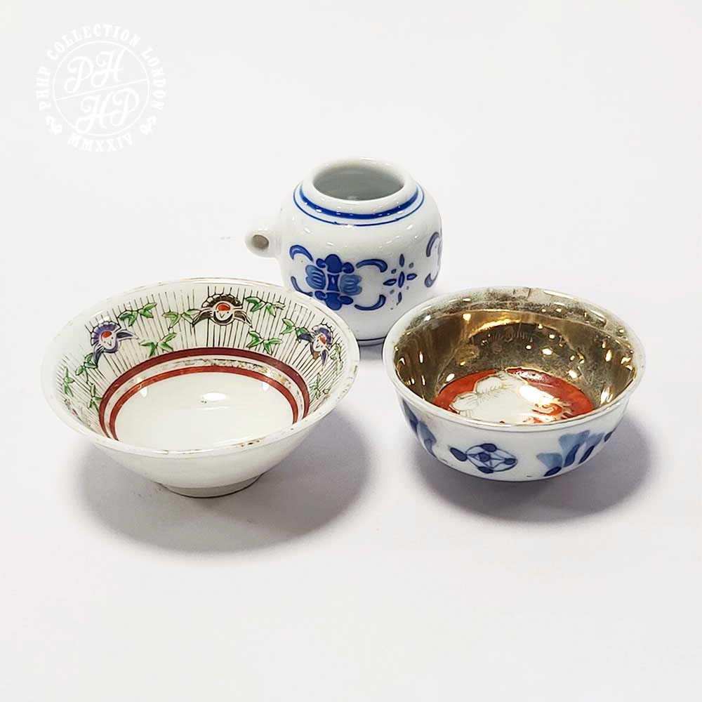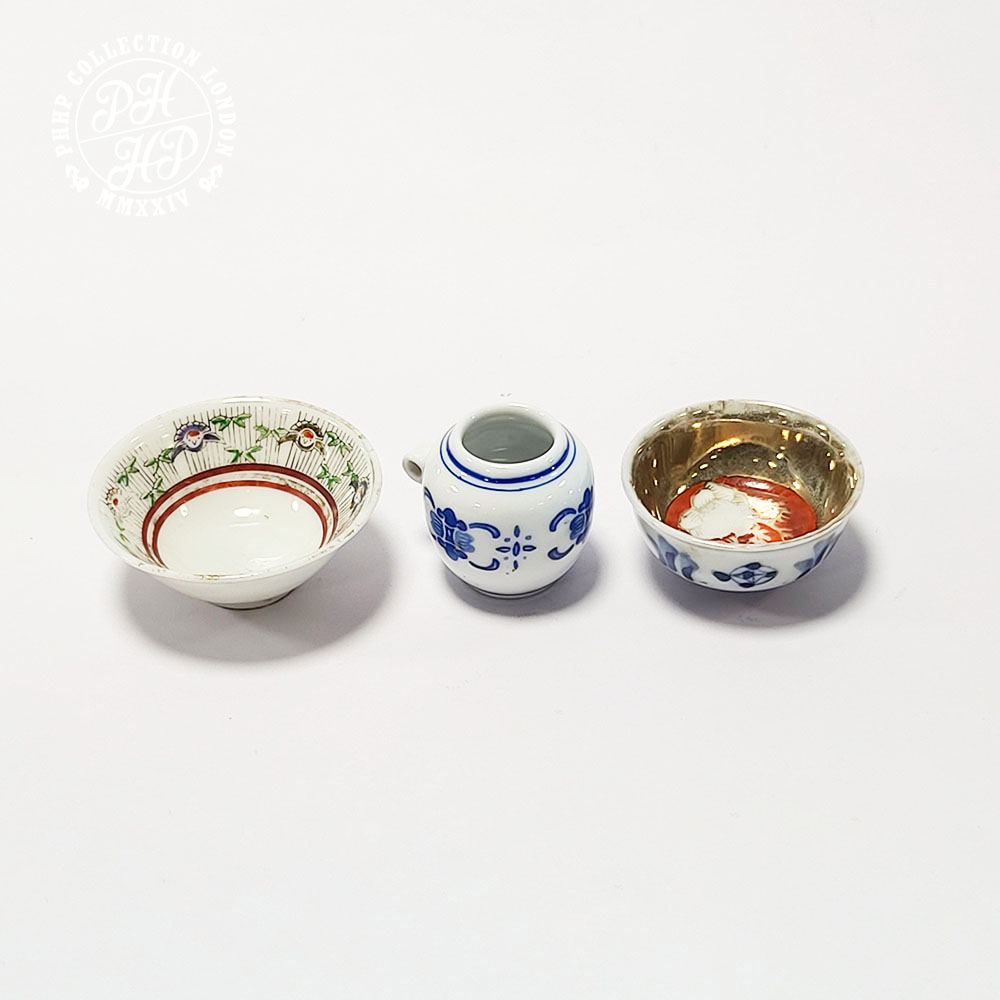 These Japanese items are all hand made, hand panted items of porcelains. One family verte bowl depicts green, black Arita feature, whist 24 crt gold plated bowl has a distinct blue and white cobalt blue in underglaze and other tiny jar is in cobalt blue in underglaze plate. These tiny pieces were probably produced for the purpose of offering them in the shrine of Buddhist temple or worshiping shrine as a gesture gift to the divine.
